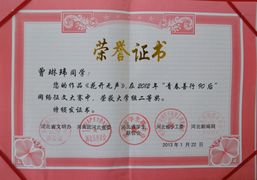 近日,从河北新闻网“青春善行90后”网络征文大赛组委会获悉,我系工商管理专业1107班学生曾琳玮的作品《花开无声》荣获网络征文大赛大学组二等奖。