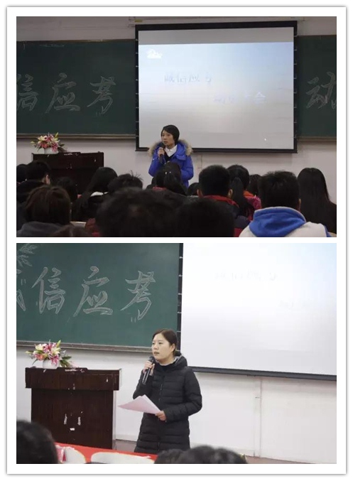 曹蒙春老师以以往同学们考试出现的作弊情况来提醒大家诚信应考;张庆老师以实例讲解了诚实对个人的重要性,要求大家做到诚实应考、认真对待班级诚信应考承诺书。
