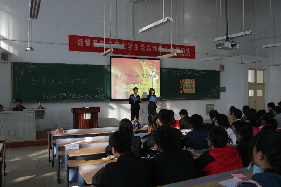 2014年11月3日早上9时许,由北京交通大学海滨学院经济管理系团委主办的第二届“大学生走向领导人才”培训班在通方楼A201开班了。